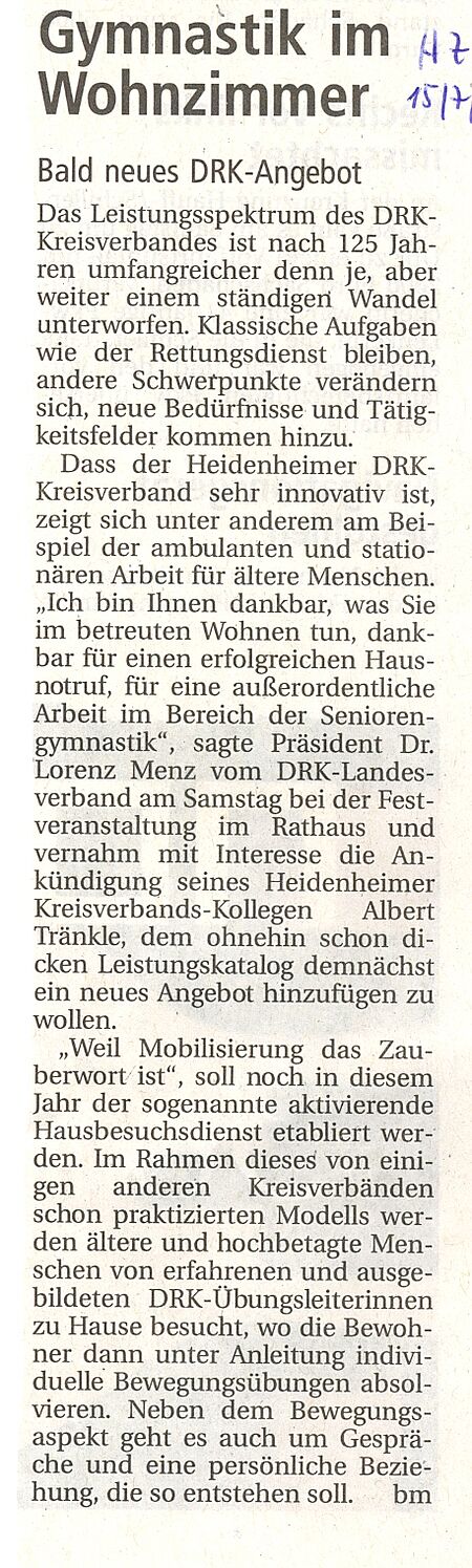 Gymnastik und Gespräche: Bewegungsangebot in den eigenen vier Wänden - DRK sucht Übungsleiter