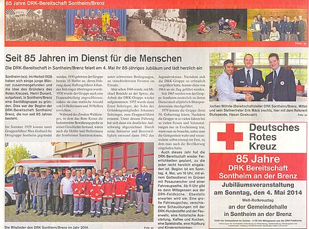 Die DRK-Bereitschaft Sontheim/Brenz feiert am 4. Mai ihr 85-jähriges Jubiläum und lädt herzlich ein (Wochenzeitung vom 26.04.14)