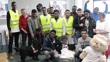 Mitglieder des DRK zeigten Flüchtlingen der Sprachklasse an der Heidtechschule Grundkenntnisse in Erster Hilfe und Rettungshundearbeit.