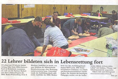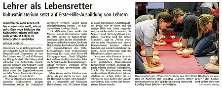 Kultusministerium setzt auf Erste-Hilfe-Ausbildung bei Lehrern (Heidenheimer Zeitung vom 05.03.16)