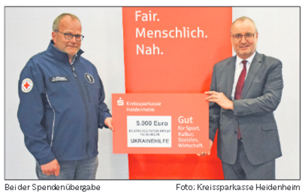 In Kooperation mit dem Deutschen Roten Kreuz Kreisverband Heidenheim unterstützt die Kreissparkasse Heidenheim die Verletzten aus dem Ukraine-Krieg mit Verbandsmaterial im Wert von 5.000 Euro. (WZ 16.04.2022)