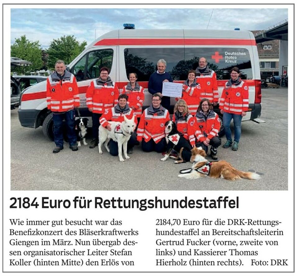 Wie immer gut besucht war das Benefizkonzert des Bläserkraftwerks Giengen im März. Nun übergab dessen organisatorischer Leiter Stefan Koller (hinten Mitte) den Erlös von 2.184,70 Euro für die DRK-Rettungshundestaffel an Bereitschaftsleiterin Gertrud Fucker (vorne, zweite von links) und Kassierer Thomas Hierholz (hinten rechts).