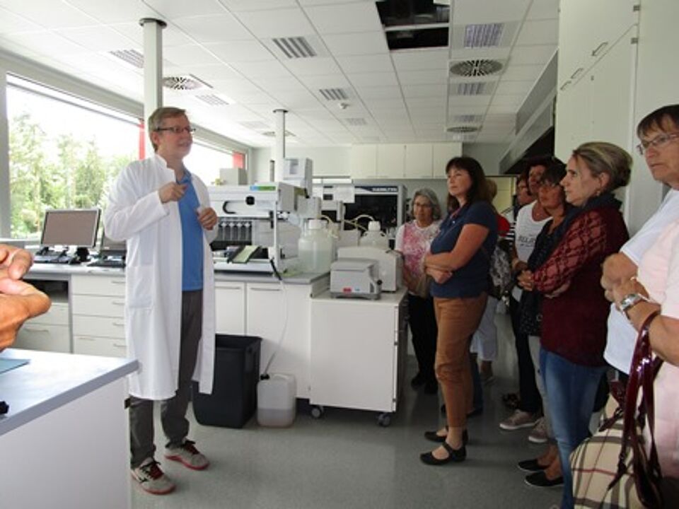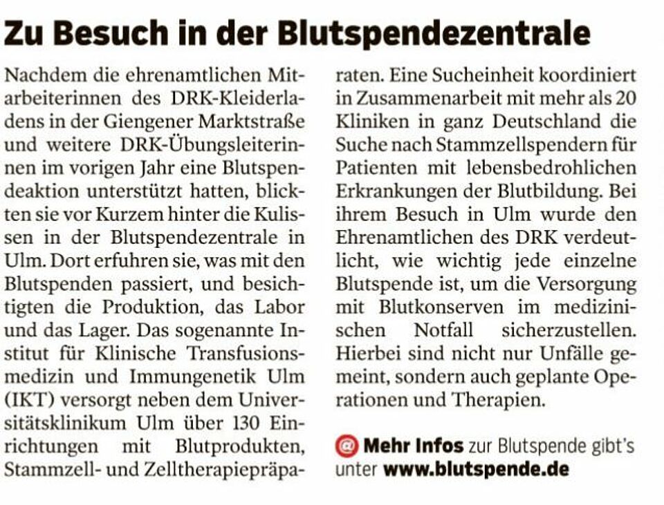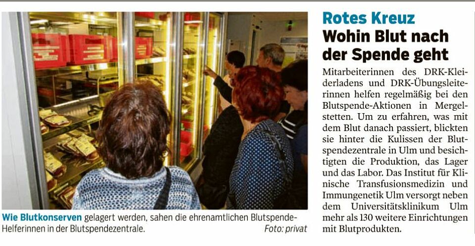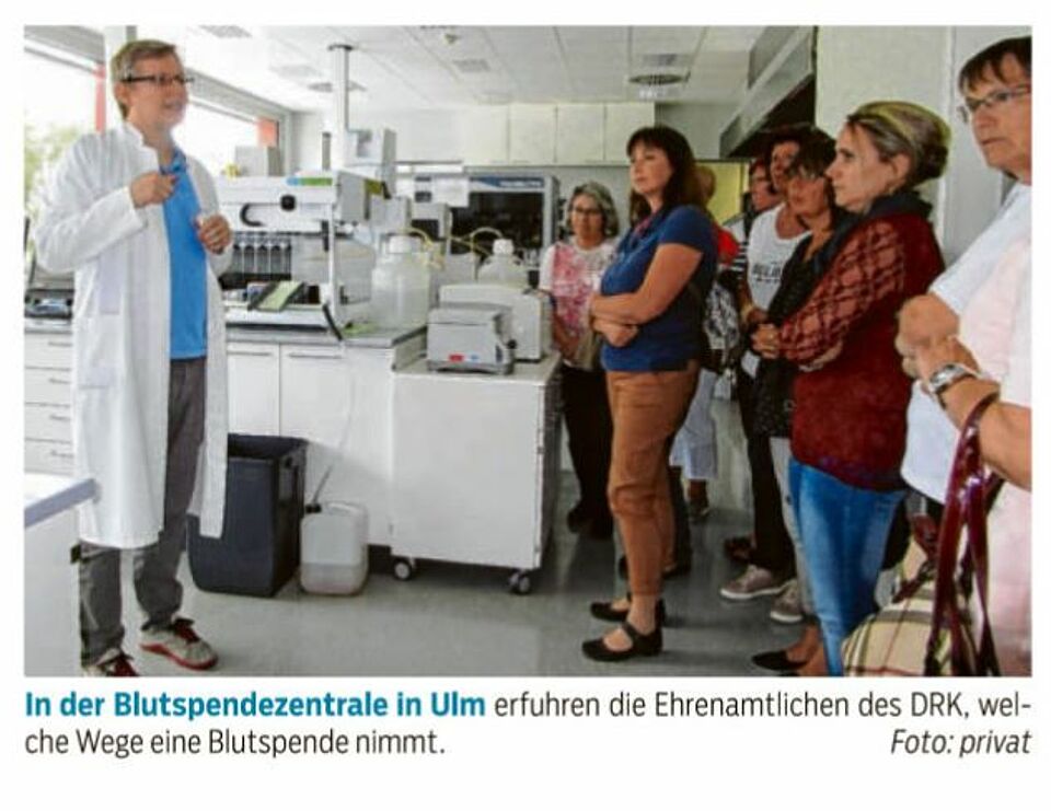 Dies nahmen sie zum Anlass, um mehr über das Thema Blutspende und was mit den Blutspenden nach einer Blutspende-Aktion passiert zu erfahren. Vor kurzem konnten die Ehrenamtlichen dann einmal hinter die Kulissen blicken. Bei einer gemeinsamen Besichtigung der Blutspendezentrale in Ulm bekamen sie von Herrn Dr. Fürst zunächst alle wichtigen Informationen rund um das Thema Blutspende erläutert. Im Anschluss konnte dann die Blutspendezentrale, die Produktion, das Labor und das Lager besichtigt werden.