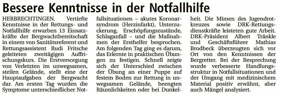 Zweitägiger Auffrischungskurs zum Erwerb vertiefter Kenntnisse in Rettungs- und Notfallhilfe (Heidenheimer Zeitung vom 05.05.15)