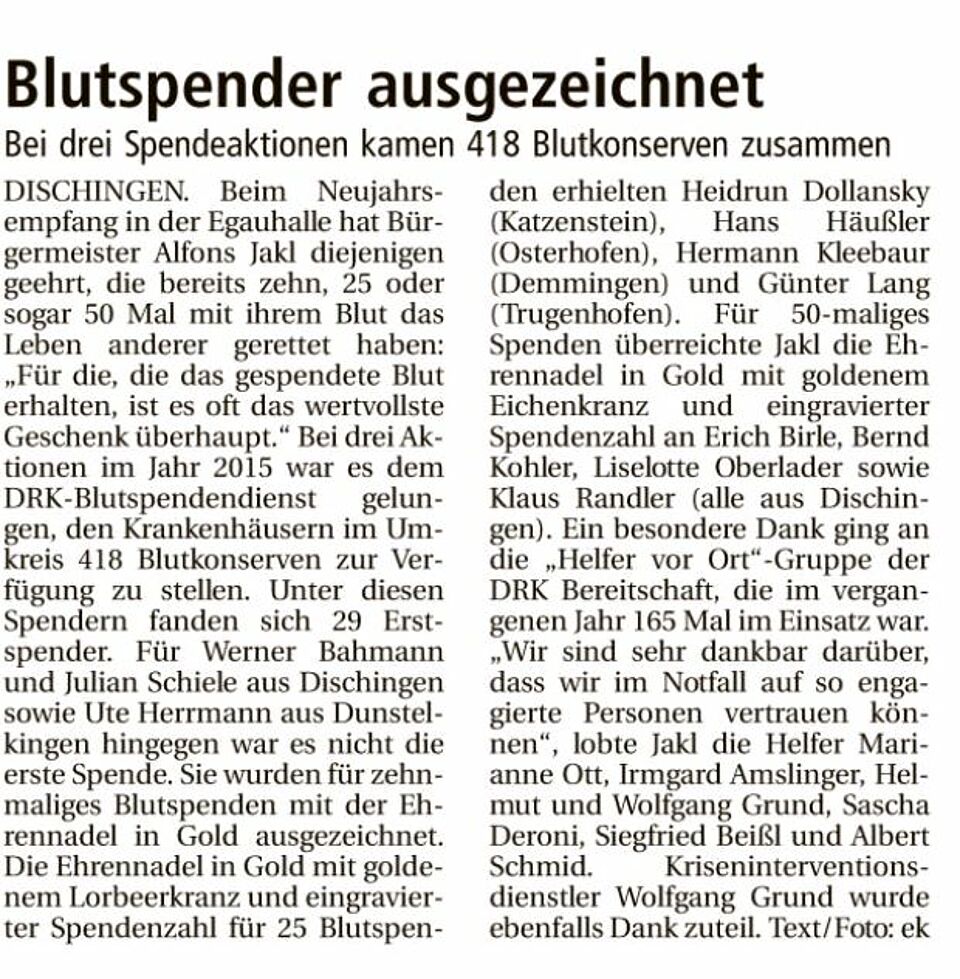 Bei drei Spendenaktionen kamen 418 Blutskonserven zusammen (Heidenheimer Zeitung v. 20.01.16)