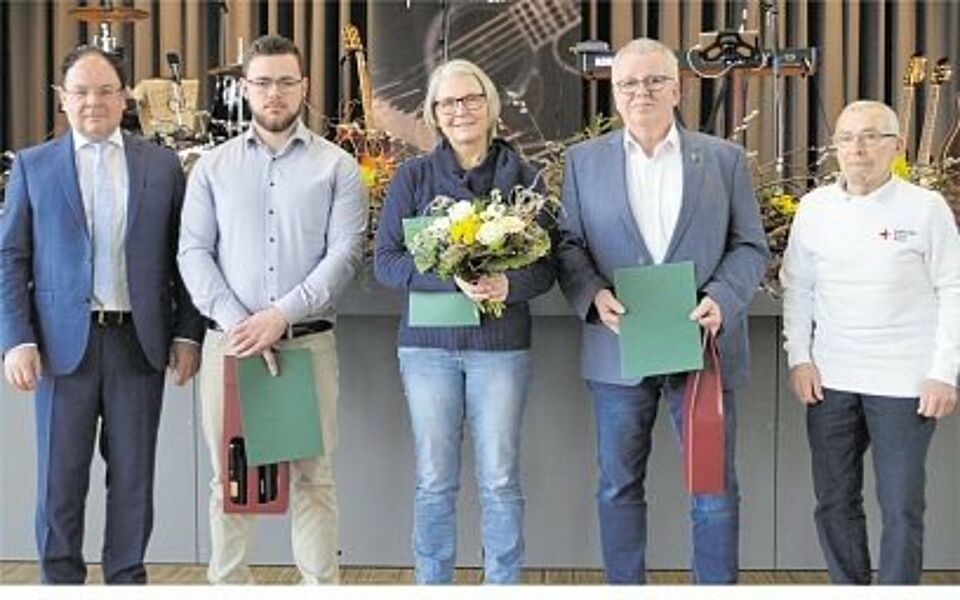 Hermaringen - "Sie sind wahre Helden unserer Gemeinschaft", lobte Hermaringens Bürgermeister Jürgen Mailänder beim Neujahrsempfang. Gemeint waren drei Einwohner, die es gemeinsam auf insgesamt 160 Blutspenden bringen. Für 100 bzw. 50 Spenden erhielten Günther Kastler und Susanne Kreh die Ehrennadel in Gold mit goldenem Eichenkranz und eingravierter Spendenzahl. Dominik Venghaus erhielt für zehn Spenden die Ehrennadel in Gold.