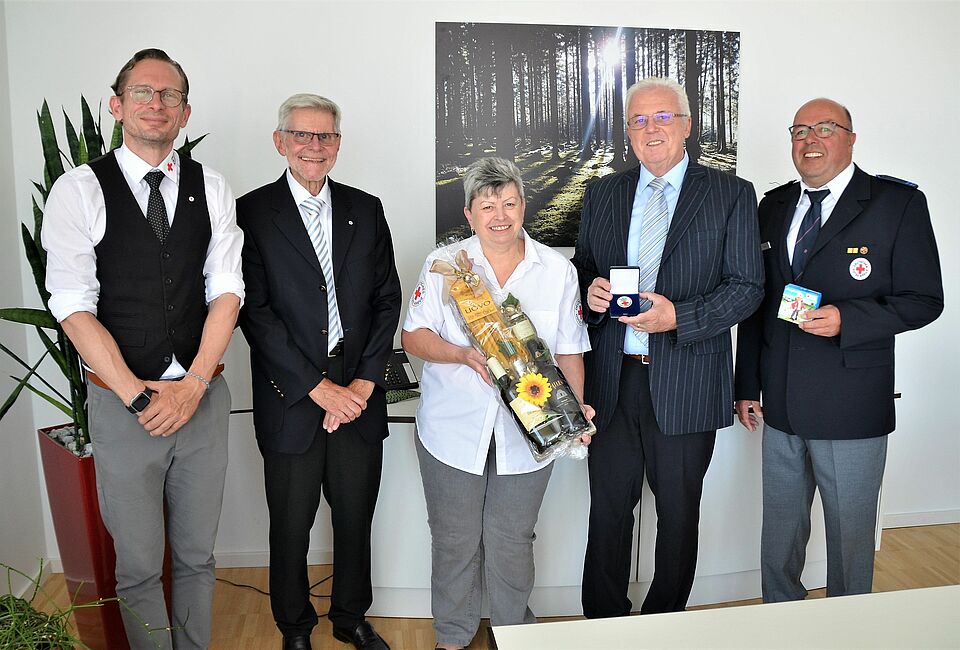 In einer kleinen Ehrungsfeier im Gerstetter Rathaus erhielt Polaschek für seine Leistung vor kurzem eine seltene und ganz besondere Ehrung. In Vertretung der Präsidentin Barbara Bosch des DRK-Landesverbands Baden-Württemberg kam eigens Landesgeschäftsführer Marc Groß nach Gerstetten, um stellvertretend für die Präsidentin deren Grüße und Dank für das außergewöhnliche Engagement von Roland Polaschek zu überbringen. Anwesend waren zu diesem besonderen Anlass auch der Präsident des DRK-Kreisverbands Heidenheim, Dr. Bernhard Konyen sowie DRK-Kreisgeschäftsführer Mathias Brodbeck. Stellvertretend für den DRK-Ortsverband waren der neue Ortvereinsvorsitzende Georg Jäger sowie Bereitschaftsleiterin Margit Rehm gekommen.