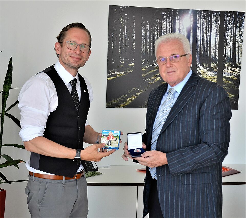 Marc Groß überreichte Bürgermeister Polaschek, stellvertretend für die Präsidentin Bosch des DRK Landesverbands Baden-Württemberg, die Dankesmedaille der Präsidentin und hatte auch noch einen kleinen DRK-Retter (von Playmobil) als Geschenk dabei.