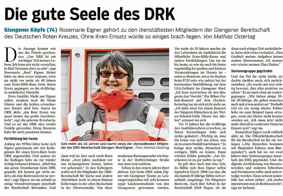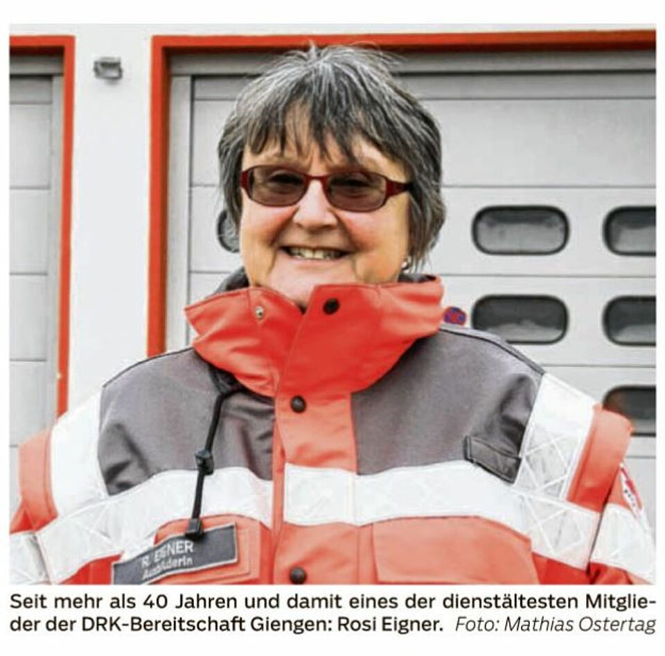 Rosemarie Eigner gehört zu den dienstältesten Mitgliedern der Giengener Bereitschaft des Deutschen Roten Kreuzes. Ohne ihren Einsatz würde so einiges brach liegen. (Heidenheimer Zeitung v. 18.11.16)