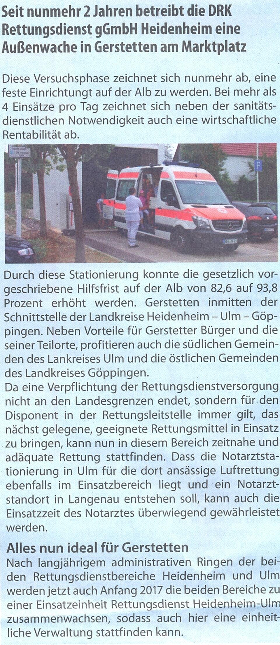 DRK Rettungsdienst betreibt Außenwache in Gerstetten am Marktplatz