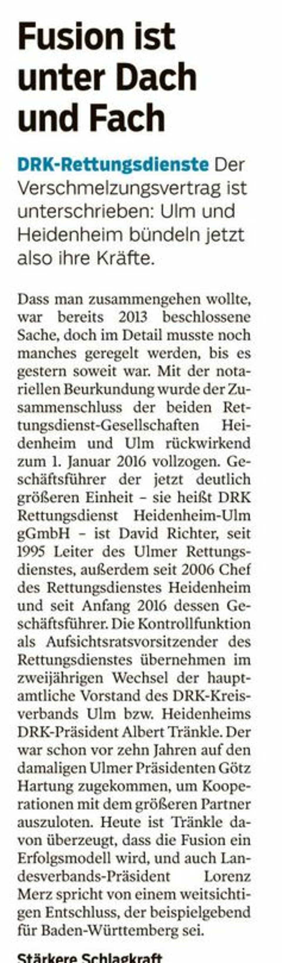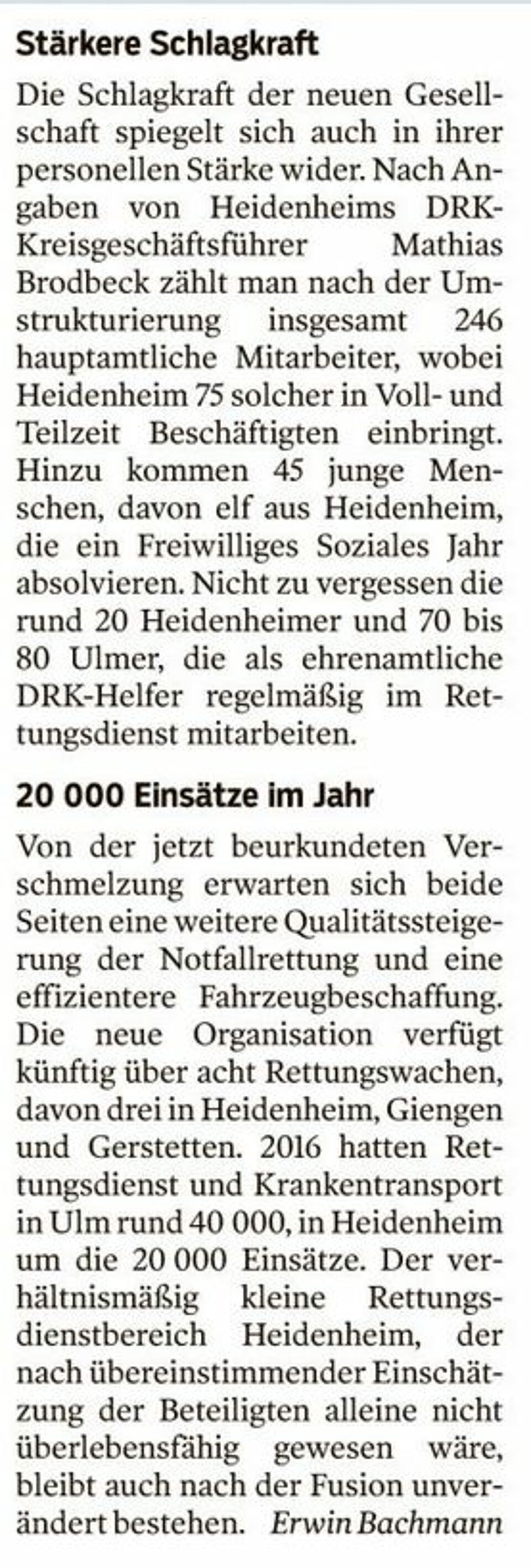 Die Kreisverbände Ulm und Heidenheim des Deutschen Rotes Kreuzes haben ihre Rettungsdienste fusioniert. In Ulm ändert sich darüber hinaus einiges (SWP Ulm u. HZ v. 28.06.17)