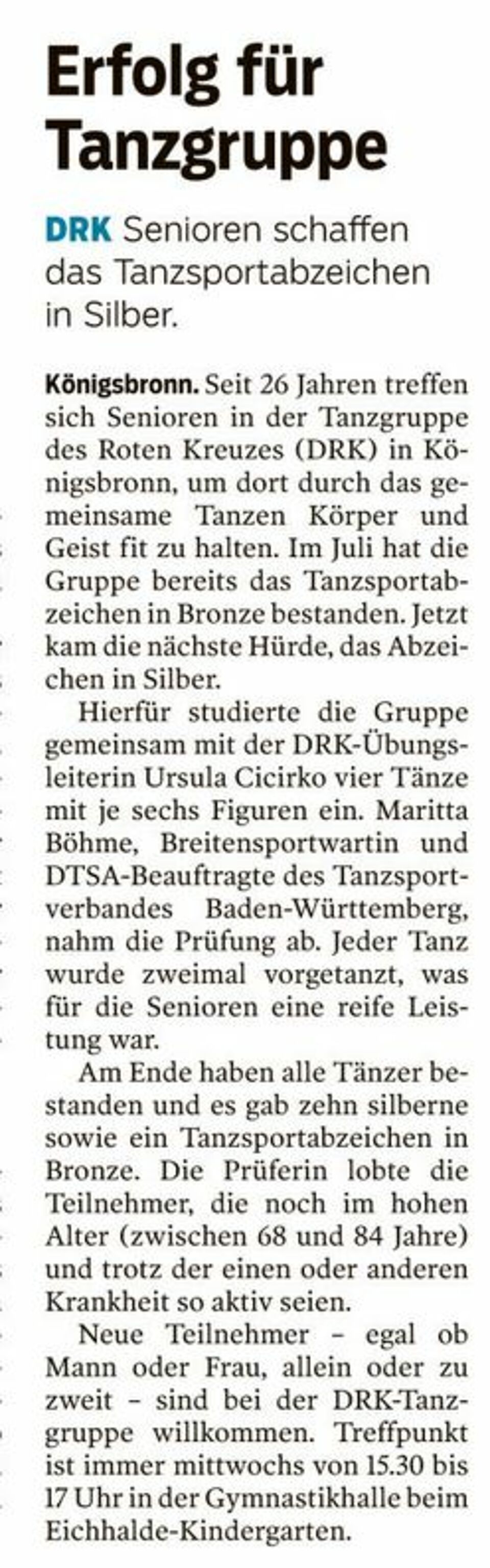 Hierfür studierte die Gruppe gemeinsam mit der DRK-Übungsleiterin Ursula Cicirko vier Tänze á 6 Figuren ein. Am Mittwoch den 22.11.17 war es dann soweit, die Breitensportwartin + DTSA-Beauftragte des Tanzsportverbandes Baden-Württemberg Maritta Böhme nahm die Prüfung ab. Jeder Tanz wurde zweimal vorgetanzt, was für die Senioren eine reife Leistung war. Am Ende haben alle Tänzerinnen und Tänzer bestanden. Frau Böhme konnte zehn silberne Tanzsportabzeichen, sowie ein Tanzsportabzeichen in Bronze verleihen. Die Prüferin lobte die Teilnehmer, welche noch im hohen Alter (zwischen 68 und 84 Jahre) und trotz der ein oder anderen Krankheit so aktiv sind. Anschließend wurde dann bei einem gemeinsamen Abendessen in der Ziegelhütte gefeiert. Über neue Teilnehmer und Teilnehmerinnen würde sich die Gruppe sehr freuen, egal ob Mann oder Frau, allein oder zu zweit. Die DRK-Tanzgruppe trifft sich immer mittwochs von 15:30 – 17 Uhr in der Gymnastikhalle beim Eichhalde Kindergarten. Interessierte sind herzlich zu einer Schnupperstunde eingeladen.