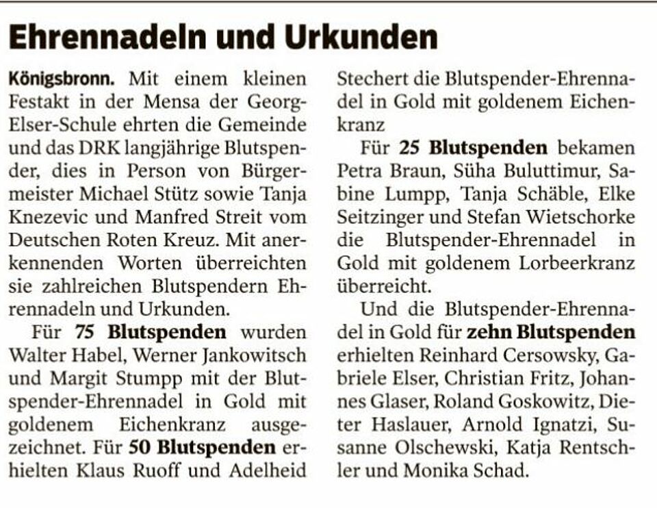 DRK Bluspenderehrung in Königsbronn (Heidenheimer Zeitung v. 08.12.16)