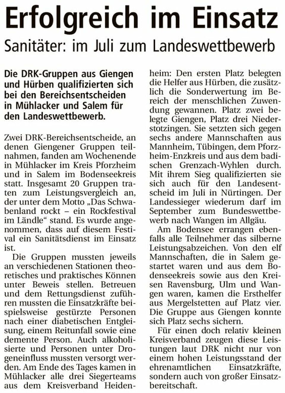 Sanitäter: Im Juli zum Landeswettbewerb (Heidenheimer Zeitung v. 20.04.16)