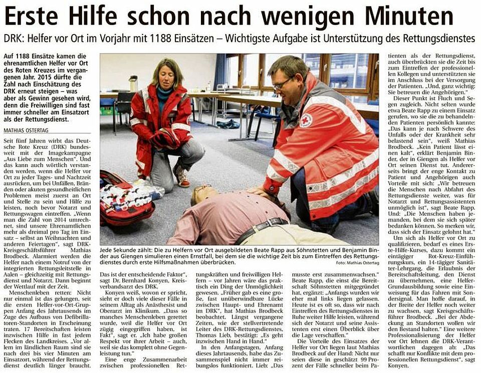 DRK: Helfer vor Ort im Vorjahr mit 1188 Einsätzen - Wichtigste Aufgabe ist Unterstützung des Rettungsdienstes (Heidenheimer Zeitung v. 29.10.15)