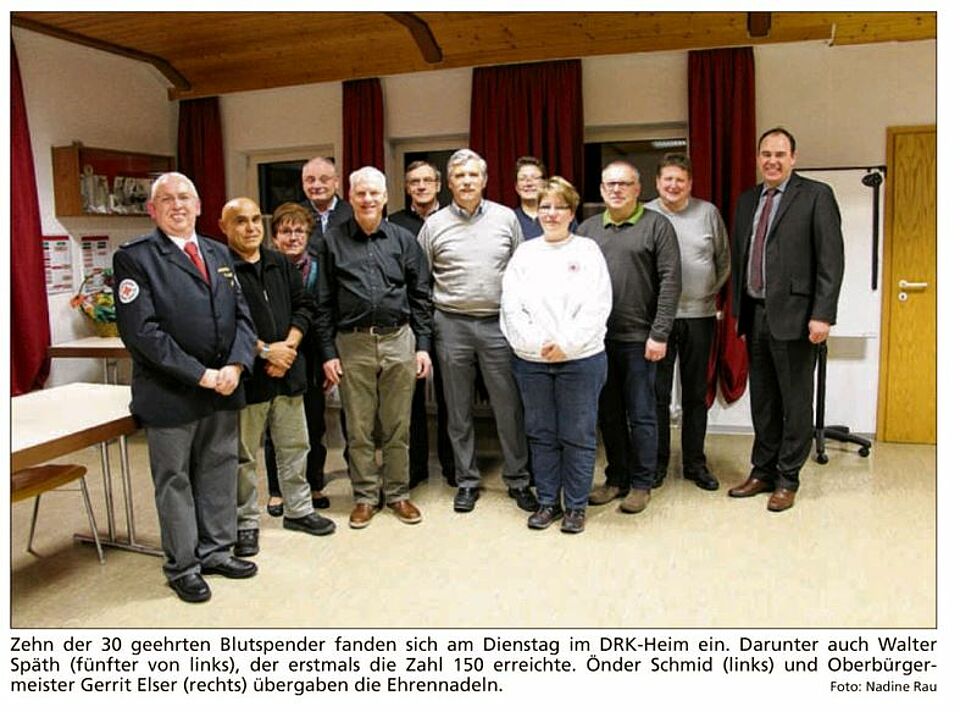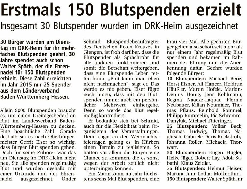 Insgesamt 30 Blutspender wurden im DRK-Heim ausgezeichnet (Heidenheimer Zeitung v. 14.01.16)