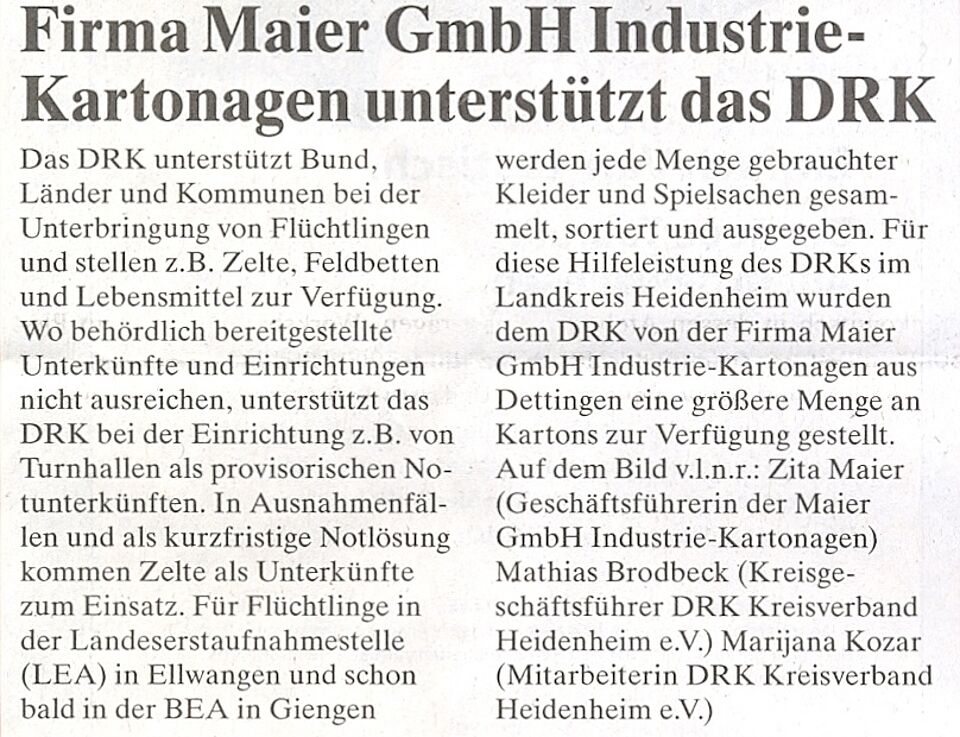 Fa. Maier GmbH Industriekartonagen unterstützt das DRK