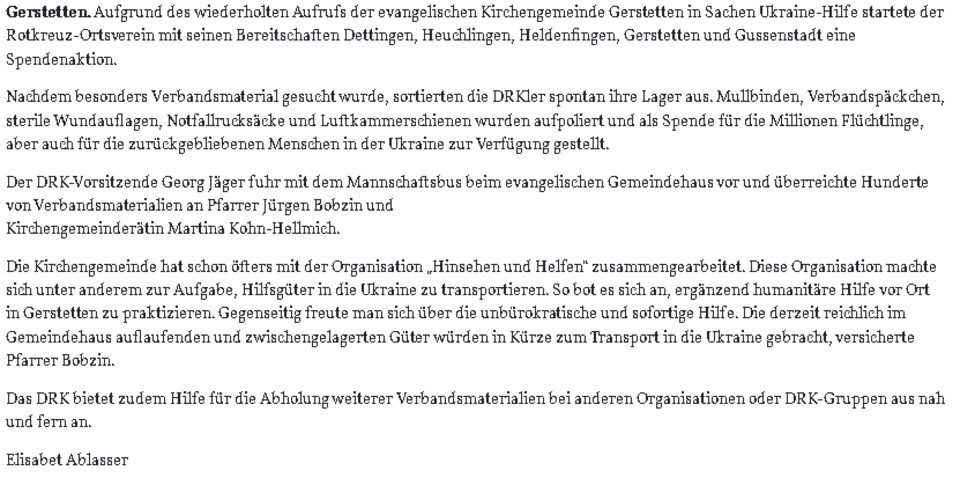 Das DRK Gerstetten startet eine Spendenaktion. (HZ v. 07.04.22)