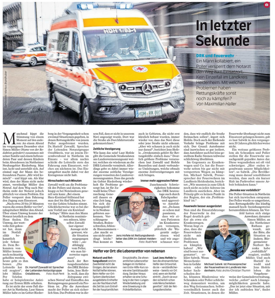 Zawadil weiß um die Problematik des Pollers und darum, wie knapp es bei Noteinsätzen generell sein kann: "Bei einem Herz-Kreislauf-Stillstand hat man drei bis fünf Minuten, bevor das Gehirn Schaden nimmt. Glücklicherweise war es bei diesem Vorfall nur ein Kreislaufkollaps." Hätte man den Mann in Nattheim reanimieren müssen, hätte selbst Zawadil laut eigener Aussage nicht gewusst, wie die Situation ausgegangen wäre - "unabhängig vom Poller, wie man fairerweise sagen muss".