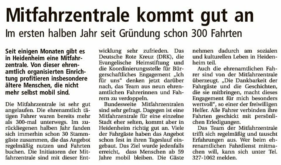 Im ersten halben Jahr seit Gründung schon 300 Fahrten (Heidenheimer Zeitung v. 18.07.15)