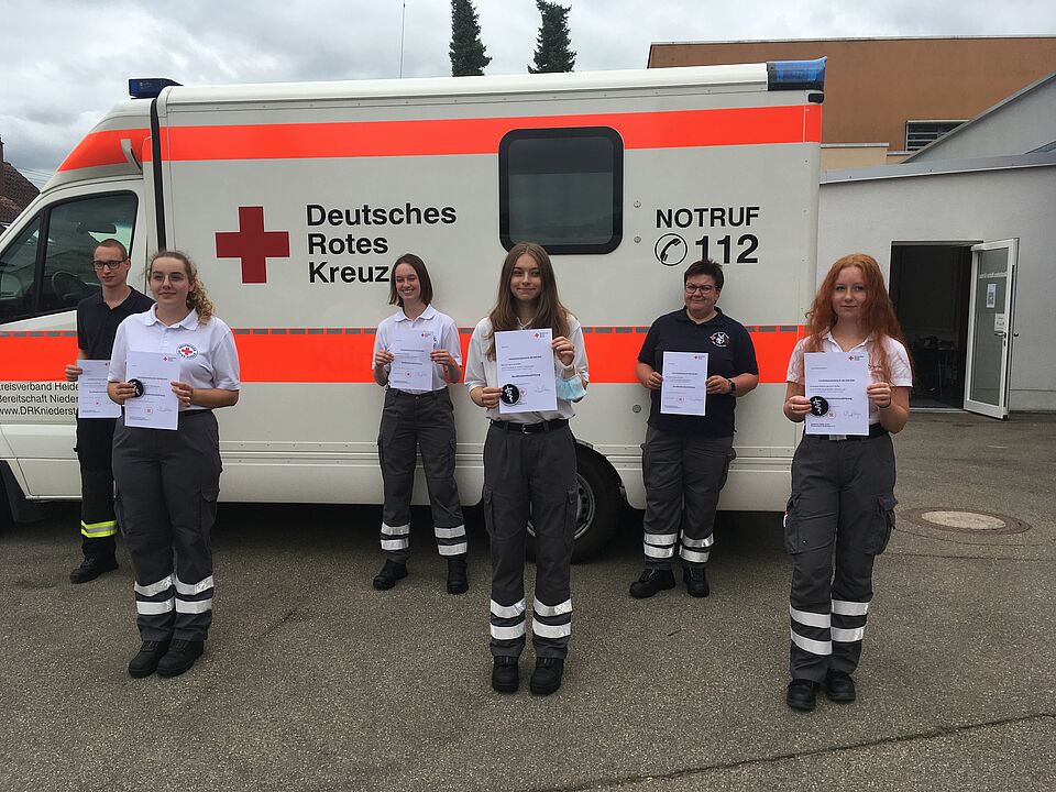Die Prüfung dauerte mehrere Stunden und bestand aus einem praktischen und schriftlichen Teil. Vom Herzinfarkt bis zur Kopfverletzung wurden verschiedene Szenarien gelehrt, um im Ernstfall gut ausgebildete freiwillige Helfer einzusetzen. Die im Notfall vor Ort sind und die Zeit bis zum Eintreffen des Rettungsdienstes mit lebensrettenden Maßnahmen überbrücken. Präsident und Kreisverbandsarzt Dr. Konyen und Notarzt Dr. Frammelsberger haben die Prüfung bei allen sechs Teilnehmern erfolgreich abgenommen. Ein besonderer Dank geht an alle Helfer.