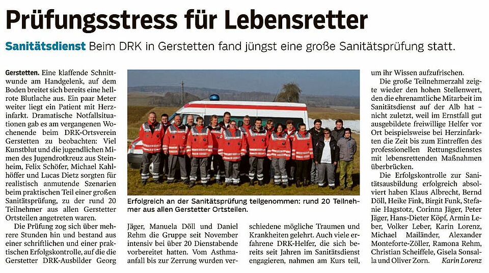 Beim DRK in Gerstetten fand jüngst eine große Sanitätsprüfung statt (HZ v. 21.02.17).