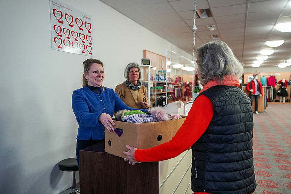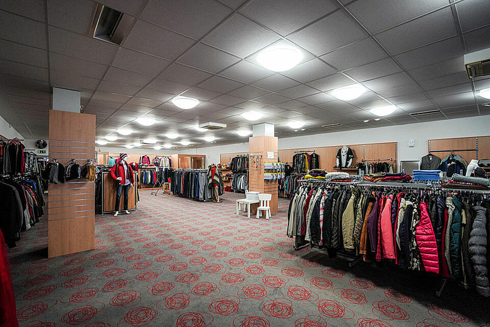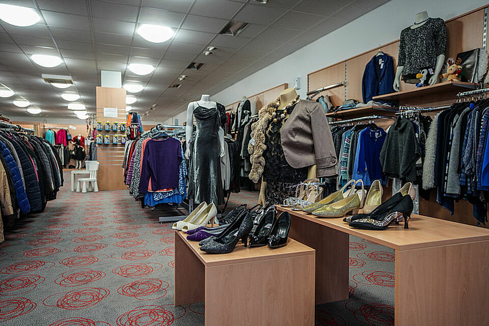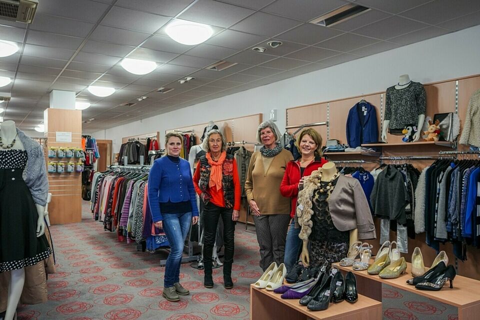 350 Quadratmeter Verkaufsfläche, liebevoll dekorierte Schaufenster, Modellpuppen, die einige Stücke zeigen, Schuhregale, Taschen, Gürtel, gesonderte Bereiche für Abend- oder Jugendmode. Wer eine Beratung braucht, bekommt sie von Ladenleiterin Natalia Wilmann oder von einem oder einer der ehrenamtlichen Helfer und Helferinnen, von denen manche schon dabei sind, seit es den Laden gibt.