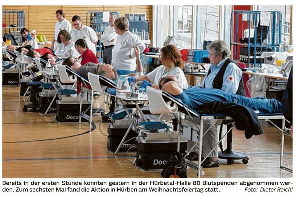 Längst etabliert ist die am Weihnachtsfeiertag laufende Aktion beim DRK Hürben, die gestern zum mittlerweile sechsten Mal in der Hürbetal-Halle stattfand. (Heidenheimer Zeitung v. 27.12.16)