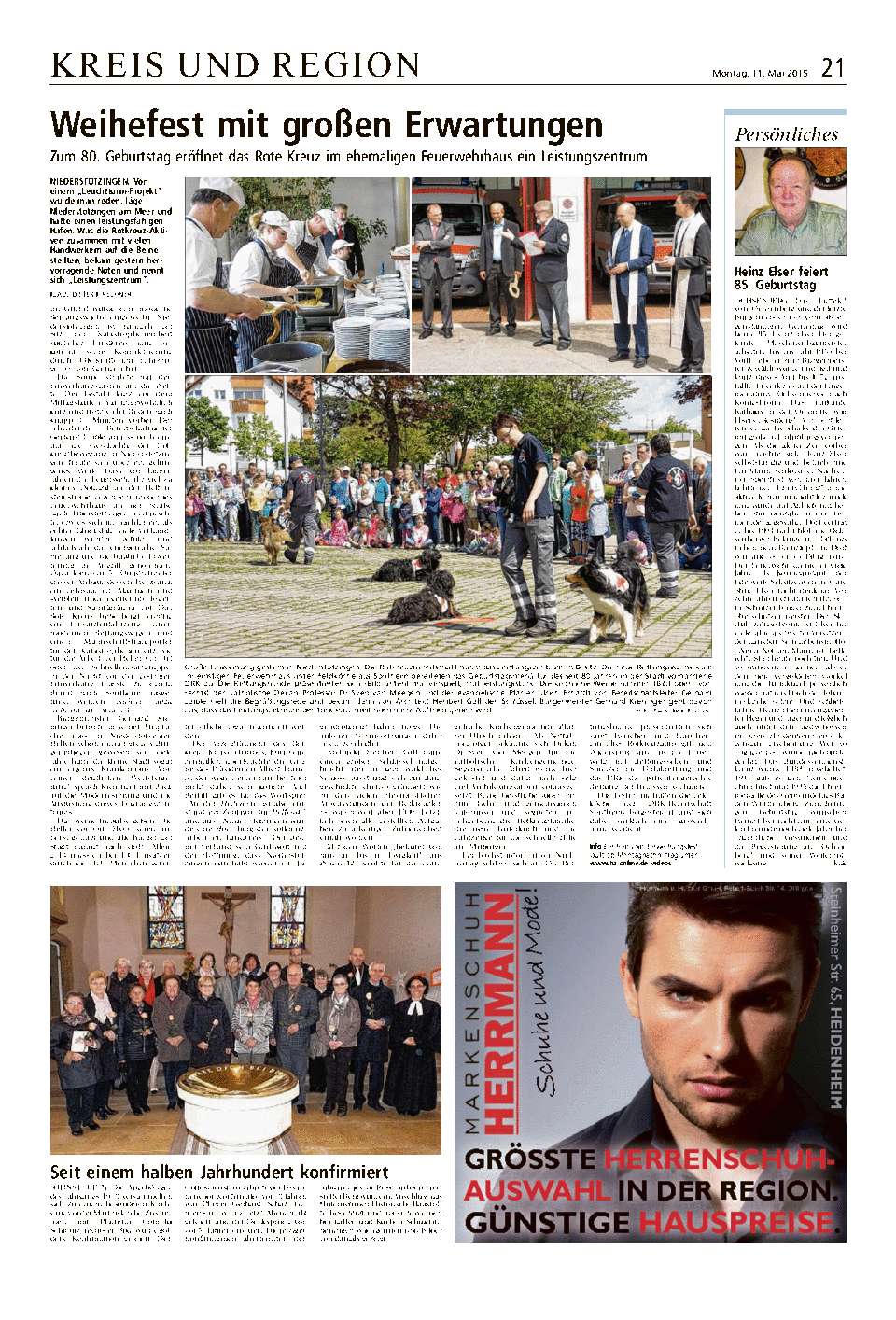 Zum 80. Geburtstag eröffnet das Rote Kreuz im ehemaligen Feuerwehrhaus ein Leistungszentrum (Heidenheimer Zeitung v. 11.05.15)