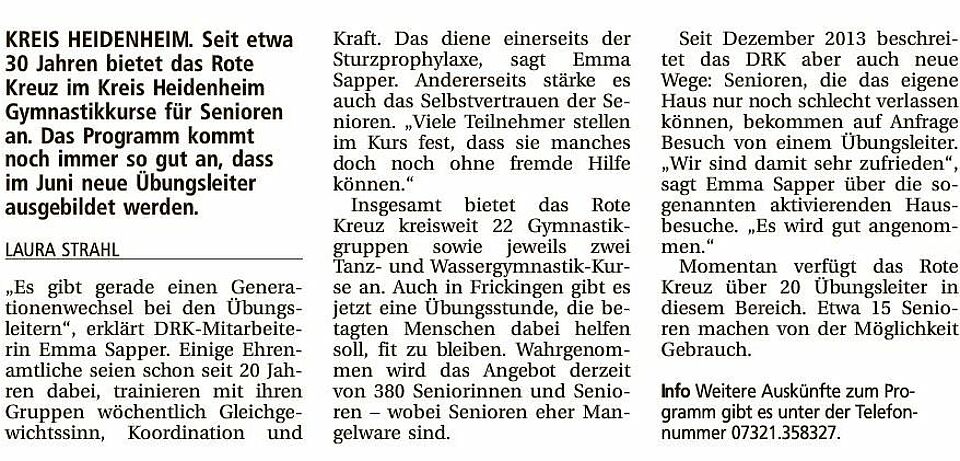 Rotes Kreuz bietet neue Gruppe in Frickingen - Generationswechsel bei den Übungsleitern (Heidenheimer Zeitung v. 19.05.15).