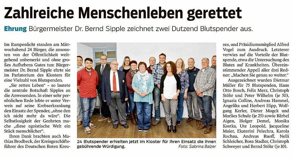 Bürgermeister Dr. Bernd Sipple zeichnet zwei Dutzend Blutspender aus. (Heidenheimer Zeitung v. 18.11.16)